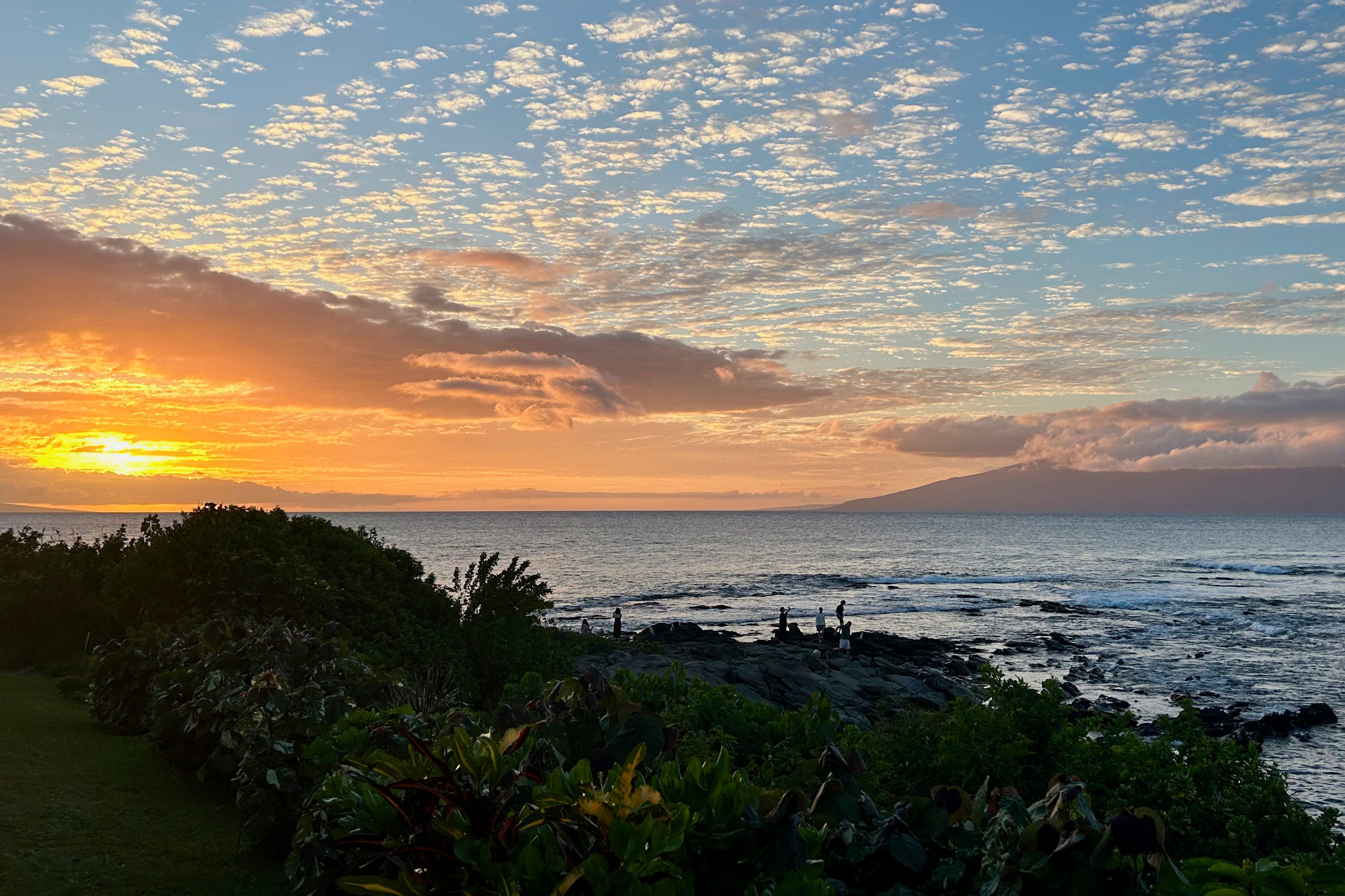 Sunsets are a big deal in Hawaii - at least among vacationers with a view of water to the west. Crowds gather every evening in anticipation. People stake out prime viewing spots for the show. The sun gets increasingly orange as it steels itself for the plunge into the ocean. The clouds catch and refract the color. Somehow, it all seems to happen more clearly and quickly than sunsets elsewhere. The sun reaches the water and then is halfway down and then is gone. The glow lingers a while, and then everybody moves on to whatever is next.